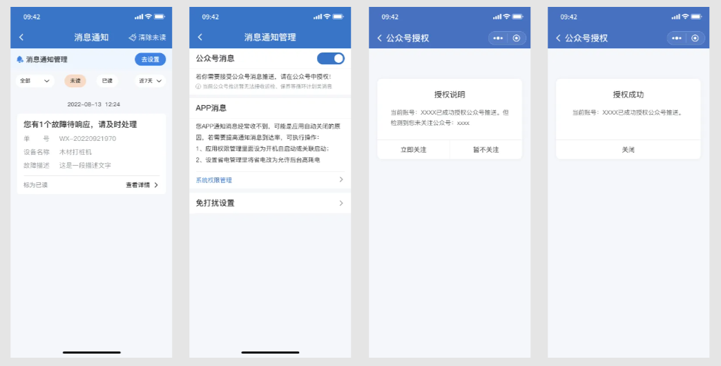 关注设备云维保公众号后,报修维修信息可在微信进行推送,确保业务及时处理不遗漏。