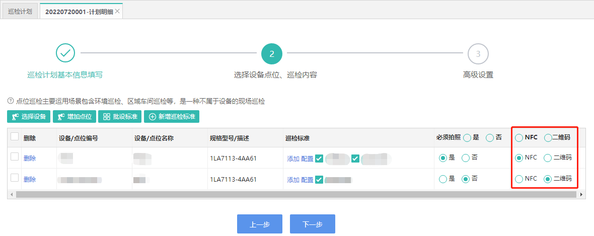 支持NFC巡检,可在巡检计划中设置执行巡检时使用NFC识别或扫描二维码形式(使用NFC巡检的设备需在移动端绑定NFC卡片)
