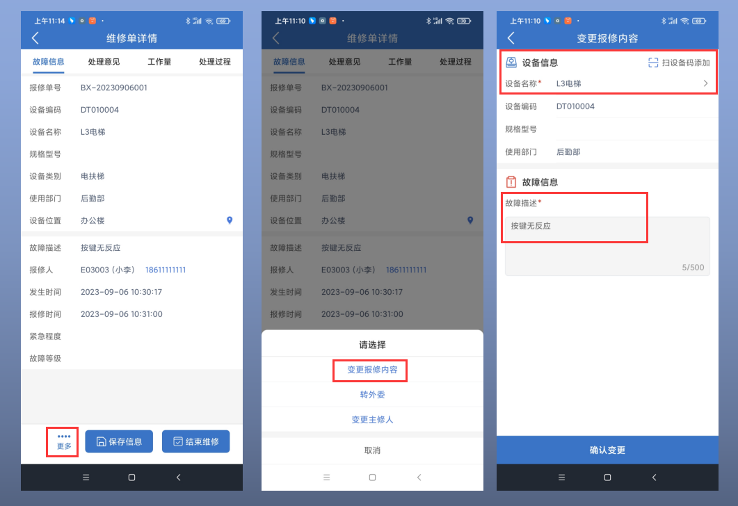 · APP端支持对【维修中】的设备维修单进行“设备名称”、“设备编码”和“故障描述”的变更 。当维修人员到达现场确认故障设备与报修人员提报的不一致时,可以直接进行故障设备和故障内容的调整。