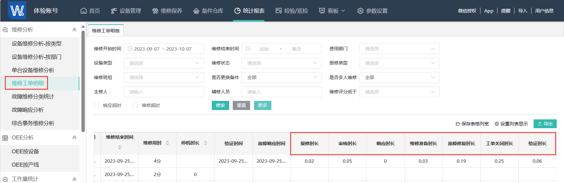 6、维修工单明细报表新增故障修复等时长统计(报修时长、审核时长、响应时长、维修准备时长、故障修复时长、工单关闭时长、验证时长)