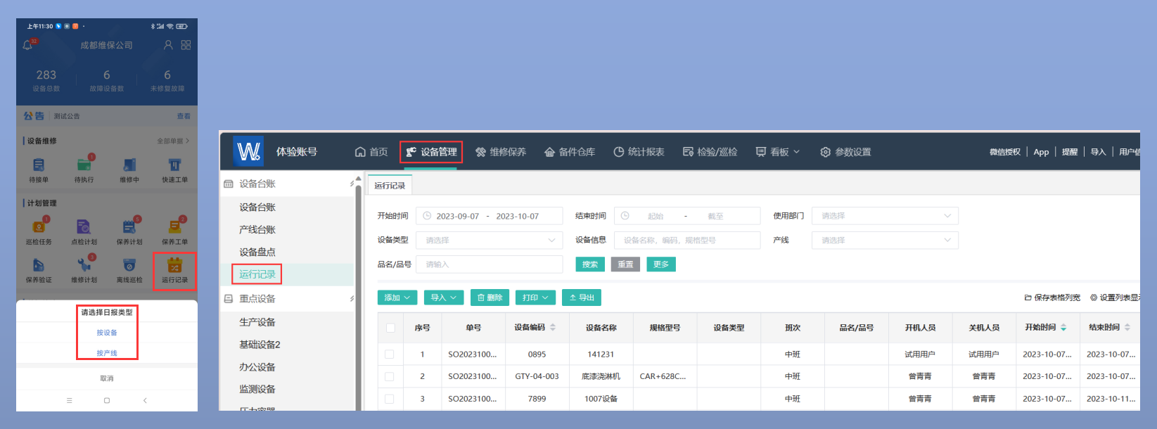 · 支持按照设备或者产线添加设备的运行记录,可单独增加,也可批量导入。