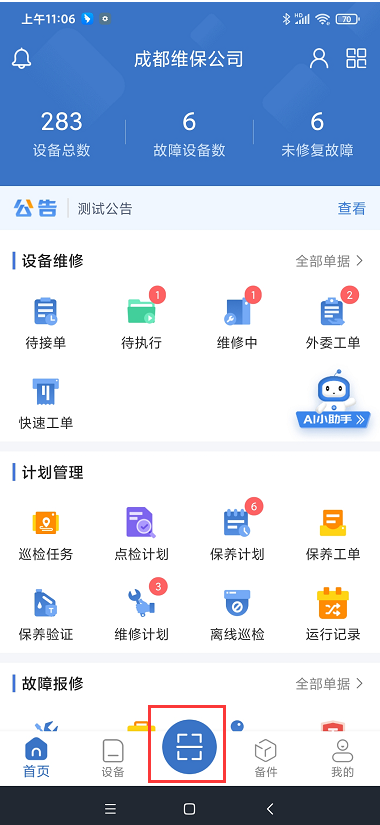 · APP端也可通过原有的【首页扫一扫】功能扫描设备后点击【开机点检】进行操作。