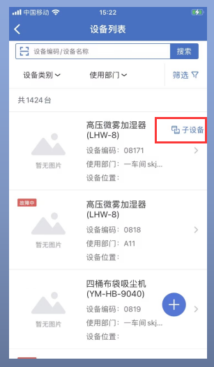 · APP端在设备列表中可按层级显示和查看子设备,同时故障提报也可以按层级选择子设备进行报修。