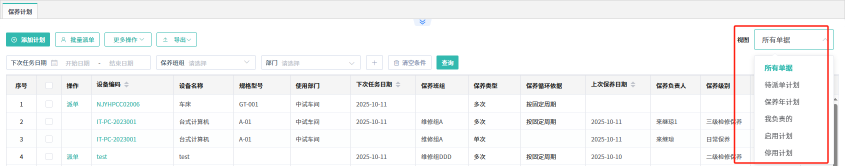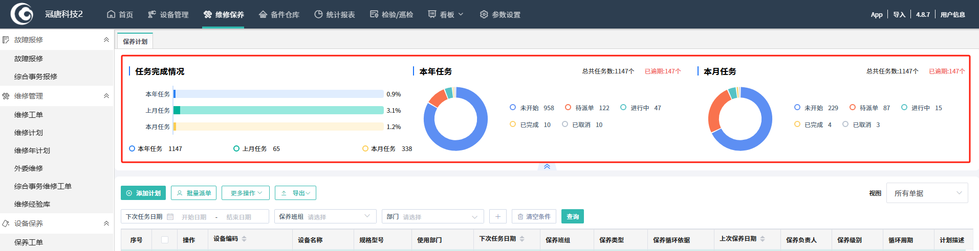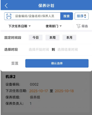 3.增强了筛选和查询功能,用户可以根据下次任务日期、保养班组、部门等条件进行筛选,并支持清空条件重新查询。