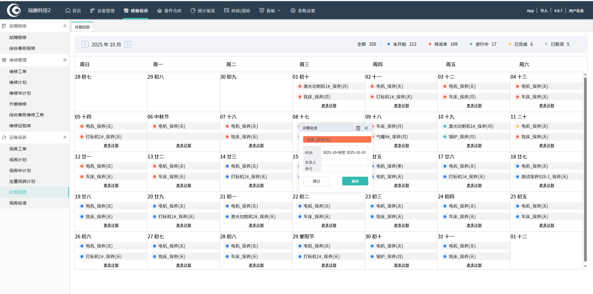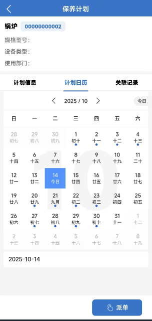 7.计划日历支持查看每日保养计划,可直接在日历中对保养计划进行派单或跳过。