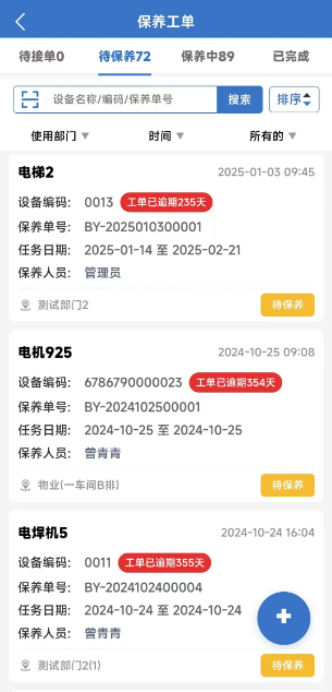 6.在任务列表中,通过不同颜色标识任务状态(如保养中、工单逾期等),便于用户快速识别任务进度。