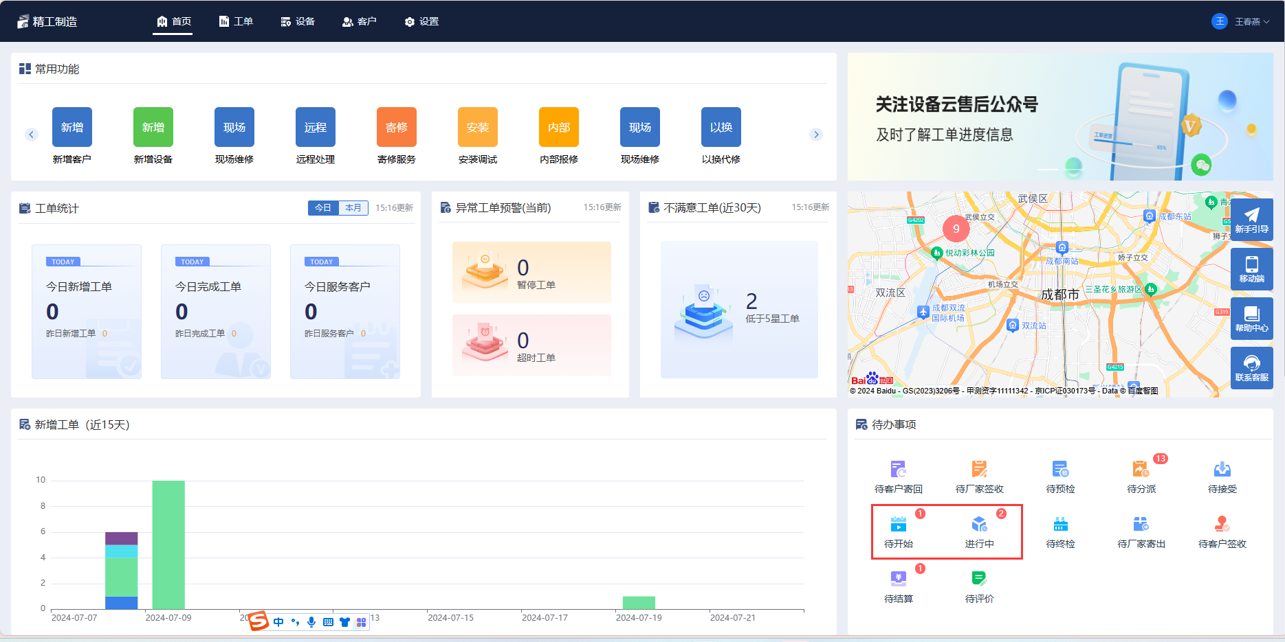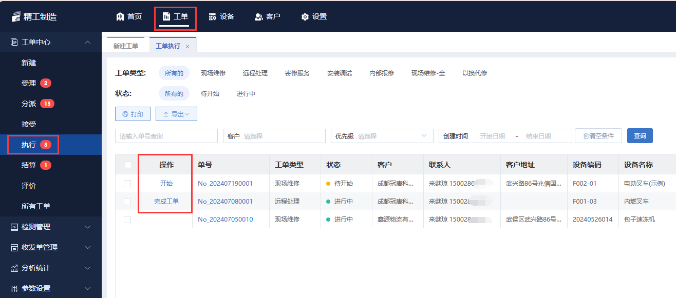 通过首页【待办事项】的【待开始】中查看还未开始执行的工单,在【进行中】查看正在执行中的工单,也可以通过【工单】-【工单中心】中的【执行】进入。