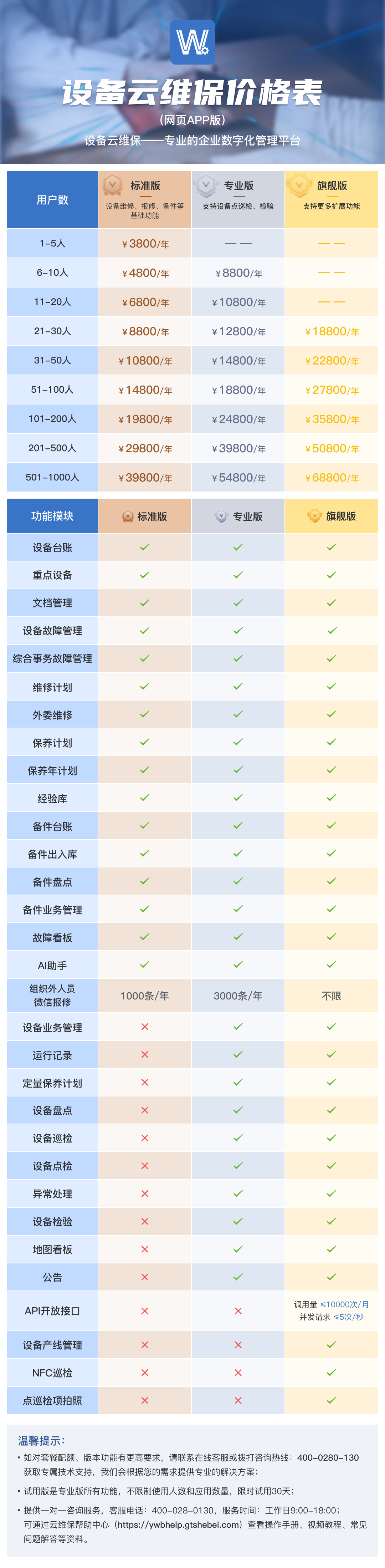 设备云维保网页版版本功能划分及价格如下,钉钉客户及企业微信客户可在应用市场中查询或者联系我们(400-028-0130)。
