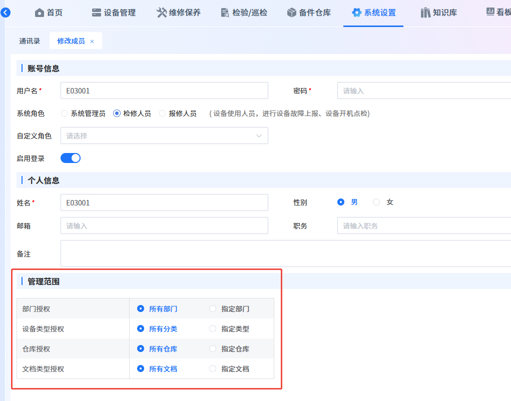 设备云维保支持对不同职责范围内的人员设置特定部门、特定类型设备的操作权限。