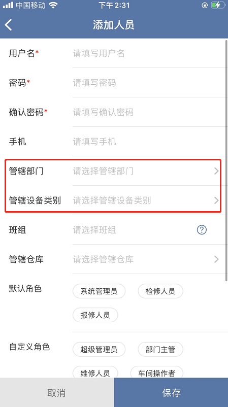 (2)添加用户或修改用户下拉设置管辖部门及管辖设备类型。