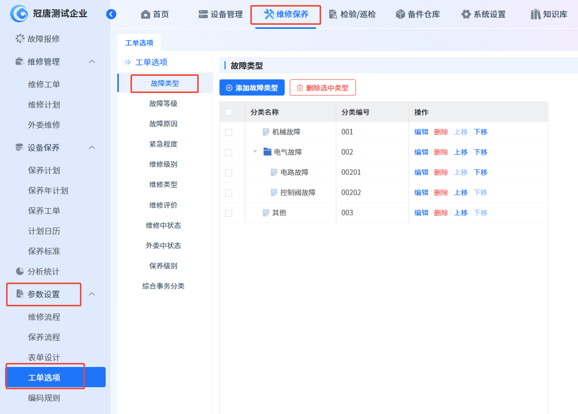 通过【维修保养】-【参数设置】-【工单选项】-【故障类型】进行设置,故障类型支持树型结构设置,方便分类管理。
