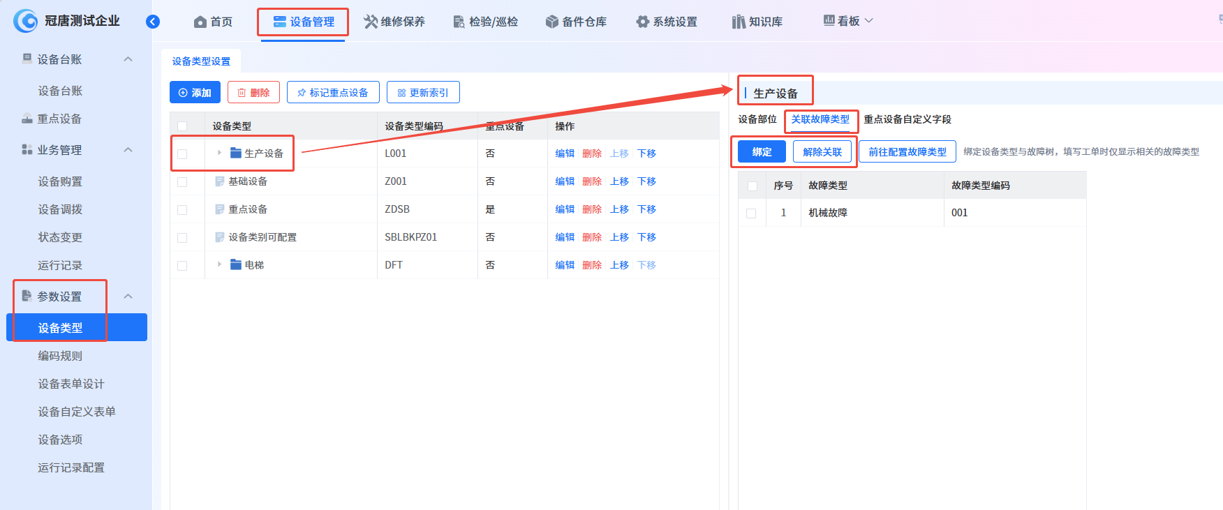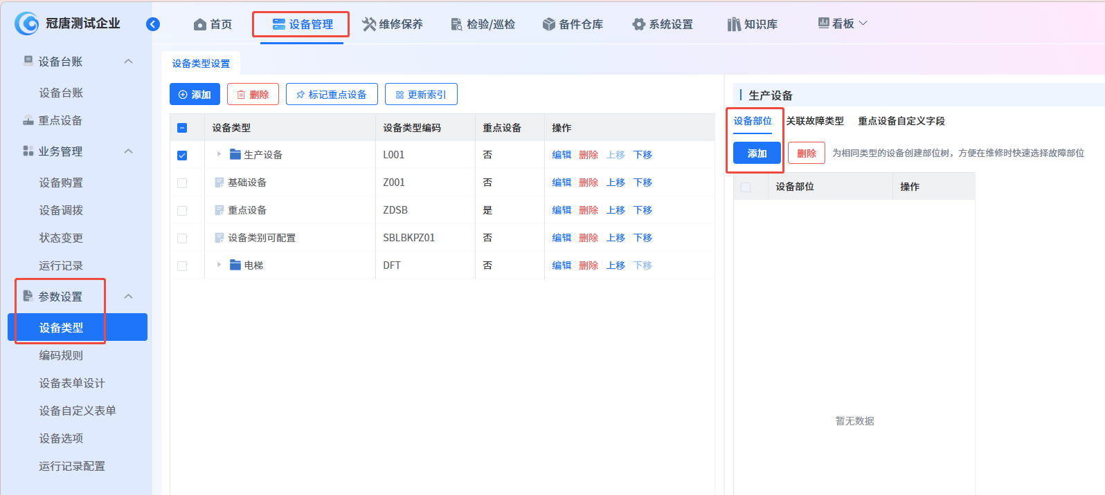 通过【设备管理】-【参数设置】-【设备类型】中对【部位】和【关联故障类型】进行设置。